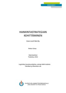 Opinnäytetyössä keskitytään hankintastrategian laatimiseen Louhi Net Oy:lle. Toimeksiantajan pyynnöstä hankintastrategia laaditaan tukemaan yrityksen liiketoiminnan tavoitteita. Opinnäytetyössä perehdytään Michael E Porterin arvoketjuanalyysin primääritoimintojen strategioihin sekä hankintastrategiaan. Opinnäytetyössä käytetään strategiatyövälineinä Pareton lakia sekä Kraljicin ostoportfolioanalyysia.