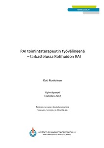 RAI(Resident Assessment Instrument)on hoidontarpeen ja laadun sekä kustannusten arviointi- ja seurantajärjestelmä. Se on kehitetty Yhdysvalloissa 80-luvun puolivälissä pitkäaikaishoidon tarpeisiin. Nyttemmin on olemassa eri sovelluksia erilaisten asiakkaiden arviointeihin, näistä yksi on opinnäytetyössä tarkasteltava Kotihoidon RAI (RAI HC- RAI HomeCare)-sovellus, joka on tarkoitettu kotihoidon piirissä oleville ikääntyneille asiakkaille. Opinnäytetyön tarkoitus on tarkastella RAI-arviointijärjestelmää suhteessa toimintaterapiaan. Teoreettisena viitekehyksenä PEO(Person-Environment-Occupation)–mallia(Law ym. 1996) sekä Suomessa virallistettua Toimintaterapianimikkeistöä (toim. Holma 2003) yhdistetään RAI- arviointimenetelmään. Opinnäytetyö koostuu teoreettisesta- ja tutkimusosuudesta. Teoreettisessa osuudessa avataan lukijalle toimintaterapiaa, toimintakyvyn arviointia yleisesti sekä RAI arviointia ja sen mittareita. Tutkimusosuus on kvalitatiivinen tutkimus, jossa Helsingin kaupungin Sosiaaliviraston vanhustenvastuualueen toimintaterapeuteilta kysyttiin sähköisellä kyselyllä miten he käyttävät RAI-arviointia työssään. Tutkimuksen tulokset osoittavat, että RAI-arviointi soveltuu toimintaterapeutin työvälineeksi.RAI-arvioinnin tulosten nähdään kuvaavan asiakkaan toimintakykyä laaja-alaisesti ja niiden perusteella terapeutti voi karkeasti arvioida tarkemmin toimintaterapian ja tarkempien toimintakyvyn arvioinnin tarvetta. Opinnäytetyön liitteeksi on tehty ehdotus oppaasta – RAI toimintaterapeutin työvälineenä- tarkastelussa Kotihoidon RAI-opastoimintaterapeuteille, jossa tiivistettynä esitellään Kotihoidon RAI:n mittarit sekä niiden yhteys toimintaterapiaan Toimintanimikkeistön (2003) avulla.