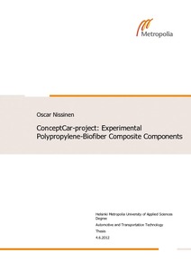 Tämän insinöörityön tavoitteena oli testata uudentyyppistä polypropeeni-biokuitukomposittia, ja kehitellä työtapoja, joilla voitaisiin valmistaa koripaneeleja ajoneuvoteollisuudessa, erityisesti ConceptCar-demonstraatioajoneuvoon. Tavoitteena oli löytää sellaisia keinoja työskennellä materiaalin kanssa, jotka sopivat projektin luonteeseen, piensarjatuotantoon ja jotka eivät vaadi kalliita, suuria tai muulla tavoin vaikeasti saatavilla olevia koneita. Materiaalille suoritettiin myös materiaalikokeita ISO/SFS standardien pohjalta tai niiden prosesseja imitoiden. Näiden materiaalikokeiden tulokset antoivat tärkeitä tietoja valmistusprosesseista. Työn tulokset on kuvattu tässä insinöörityössä.