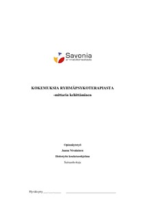 Opinnäytetyön tarkoituksena oli kehittää Kuopion yliopistollisen sairaalan KYS:n Siilinjärven psykiatrian poliklinikan työntekijöiden käyttöön mittari eli kyselylomake, jolla ryhmäpsykoterapiaryhmän ohjaajat voivat kerätä palautetta ryhmäpsykoterapiaryhmästä ja selvittää ryhmäpsykoterapian vaikuttavuutta. Tavoitteena oli myös kuvata kehitetyllä mittarilla suoritetun testitutkimuksen tulosten avulla, miten ryhmäpsykoterapia oli vaikuttanut ryhmäläisten tämänhetkiseen vointiin, tulevaisuuden näkymiin ja vuorovaikutustaitoihin ja millaista palautetta he antoivat psykoterapiaryhmästä ja ryhmän ohjaajista. Kokemusten selvittäminen ja ryhmästä saatu palaute auttavat ryhmän ohjaajia tarkastelemaan ja kehittämään omaa työtään.