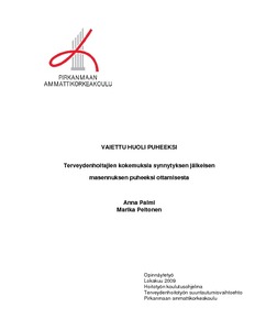 Tämän opinnäytetyön aiheena on huolen puheeksi ottaminen terveydenhoitajan työssä. Huolen puheeksi ottamista tarkasteltiin äidin synnytyksen jälkeisen masennuksen kautta. Terveydenhoitajan omakohtainen huoli asiakkaan tilanteesta on keskeinen tekijä varhaisessa puuttumisessa. Opinnäytetyön tavoitteena on lisätä terveydenhoitajien tietämystä synnytyksen jälkeisen masennuksen puheeksi ottamisesta. Työn tarkoituksena oli selvittää, mitä valmiuksia ja keinoja terveydenhoitajilla on ottaa puheeksi äidin masennus neuvolakäynnillä. Lisäksi selvitettiin millaiseksi terveydenhoitajat kokevat synnytyksen jälkeisen masennuksen puheeksi ottamisen.