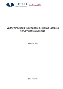 Tämän opinnäytetyön tarkoituksena oli selvittää, miten terveydenhoitajat tukevat vanhemmuutta 8. luokan laajassa terveystarkastuksessa. Valtioneuvoston asetuksessa 380/2009 määritellään neuvolatoiminnasta, koulu- ja opiskeluterveydenhuollosta sekä lasten ja nuorten ehkäisevästä suun terveydenhuollosta. Asetuksen tarkoituksena on varmistaa, että lasten ja heidän perheidensä terveysneuvonta ja terveystarkastukset ovat suunnitelmallisia, tasoltaan yhtenäisiä ja yksilöiden ja väestön tarpeet huomioon ottavia kunnallisessa terveydenhuollossa. Laajan terveystarkastuksen tarkoituksena on koko perheen hyvinvoinnin tukeminen. Laajassa terveystarkastuksessa käsitellään vanhempien ja nuorten täyttämät kyselylomakkeet. Laajan terveystarkastuksen tavoitteena on varhainen puuttuminen ja ongelmien ennaltaehkäisy.