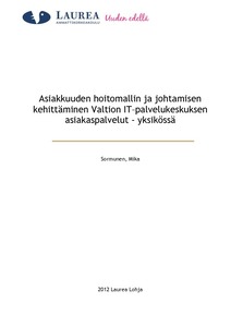 Tämän työelämälähtöinen opinnäytetyö toteutettiin tutkimuksellisen kehittämishankkeena. Kehittämishankkeen kohde organisaationa toimi Valtion IT-palvelukeskus. Hankkeen käytännön tarkoituksena oli luoda toimintamalli asiakaspalvelut-yksikölle. Päätavoitteena oli kehittää toimiva asiakaslähtöinen asiakkuudenhoitomalli, jolla johdetaan asiakkuuksia valtion organisaatioiden välisessä toiminnassa. Tämän hankkeen osa-tavoitteina oli luoda asiakassegmentit, asiakkaiden hoitosuunnitelman vuosikello sekä kehittää ja määritellä asiakkuuksien johtamiseen liittyviä tehtäviä, rooleja ja prosesseja.