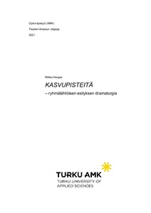Tämän opinnäytetyön tavoitteena on purkaa osiin ryhmälähtöinen esitysprosessi dramaturgin näkökulmasta. Opinnäytetyö pyrkii vastaamaan kysymykseen: miten esityksen dramaturgia voi muodostua? Tapausesimerkkinä kirjoittaja käyttää ohjaamaansa Kasvupisteitä-esitystä (Teatteri Mundo 2020). Lisäksi opinnäytetyötä varten on haastateltu kirjailija ja teatteri-ilmaisun ohjaaja Emma Puikkosta. Kirjallisina lähteinä käytetään mm. Pieta Koskenniemen Osallistava teatteri: Devising ja muita merkillisyyksiä, Hans-Thies Lehmannin Draaman jälkeinen teatteri, Juha-Pekka Hotisen Tekstuaalista häirintää, Sanna Heikkisen pro gradu -tutkielmaa Devising käytännössä ja teoriassa sekä Jarkko Suhosen pro gradu -tutkielmaa Toiminnallista dramaturgiaa.