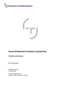 Opinnäytetyön tarkoituksena on kuvata gastroskiisipotilaan hoitoa ja siihen liittyviä erityispiirteitä. Opinnäytetyön tehtävänä oli selvittää millaisia erityispiirteitä gastroskiisipotilaan hoidossa on hoitotyön näkökulmasta. Tavoitteena on lisätä hoitohenkilökunnan tietämystä gastroskiisipotilaan hoidosta ja hoitomenetelmistä. Työ toteutettiin kuvailevana kirjallisuuskatsauksena ja tulosten analysointi tehtiin sisällön analyysin keinoin.