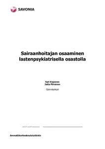 Lasten ja nuorten mielenterveysongelmat ovat lisääntyneet viimeisten vuosikymmenien aikana. Yhä useampi lapsi ja nuori tarvitsee psykiatrista avohoitoa tai laitoshoitoa. Lasten ja nuorten mie-lenterveysongelmien lisäännyttyä sairaanhoitajilta vaaditaan paljon osaamista ja erikoisosaamista tarvitaan yhä enemmän.