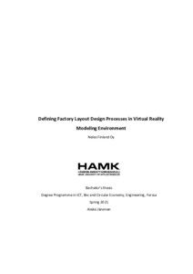 Opinnäytetyön aiheena oli määrittää prosessit sekä ohjeistukset tehdasympäristössä tapahtuvan tehdassuunnittelun virtuaaliympäristön käyttöön hyödyntämällä virtuaalitodellisuutta. Opinnäytetyön toimeksiantajana toimi Neles Finland Oy, jolle opinnäytetyöhön liittyvät prosessit määriteltiin ja ohjeistukset toteutettiin. Virtuaalisen tehdasympäristön pohjana toimii Neleksen tuotantolaitos Hakkilassa Vantaalla. Opinnäytetyö toteutettiin osallistumalla virtuaalitodellisuuden projektiin, missä luotiin digitaalinen tehdaskaksonen virtuaaliympäristöön yhdessä Geo Exact Oy:n sekä 3D Talo Finland Oy:n kanssa. Projektin aikana käsiteltiin virtuaaliympäristön toiminnallisuuksia, tehtiin parannuksia, korjauksia ja muokkausehdotuksia. Opinnäytetyötä täydennettiin tutkimalla ja perehtymällä virtuaalitodellisuuden ja layout-suunnittelun teoriaan, määriteltiin systemaattinen projektitapaamisten kulkukaavio, käsiteltiin ympäristöjen eroja ja ongelmia, huomioitiin kestävän kehityksen näkökulmaa liittyen kokonaisprosessiin, sekä toteutettiin yrityksen sisäinen kysely aiheeseen liittyen. Opinnäytetyön tuloksena saavutettiin varmuus hyödyntää virtuaalitodellisuutta tehdassuunnittelun operatiivisessa toiminnassa lähitulevaisuudessa. Neleksellä on tulossa useita tehdassuunnittelua vaativia muutoksia, joissa on tarkoitus hyödyntää opinnäytetyössä tuotettua materiaalia uutena tehdassuunnittelun metodina. The aim of the bachelor thesis was to describe processes and define instructions in factory operations for a layout design with the support of virtual reality. Neles Finland Oy was the commissioner of the thesis, for whom the processes were defined and instructions created. Neles factory in Hakkila Vantaa was used as a basis for the virtual factory environment. The thesis was executed by participating in the virtual reality project, where a digital twin of the factory was implemented into the virtual reality environment. Neles partnered with Geo Exact Oy and 3D Talo Finland Oy to complete this project. The functionalities of the virtual environment were addressed throughout the project. Recommendations for updates, improvements, and modifications were addressed and adapted. The thesis was supplemented by studying the theory of virtual reality and layout planning. Furthermore, a systematic flow for project meetings was established, environment differences and problematic issues were addressed, sustainable development perspectives were presented, and an internal survey was conducted. As a result of the thesis, certainty was achieved to utilize virtual reality for factory layout planning in operational functions in the near future. Neles is coming up with several changes that require factory layout planning, in which the material produced in the thesis will be utilized as the new factory planning method.