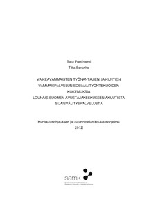Opinnäytetyön tarkoituksena oli tutkia vaikeavammaisten työnantajien ja kuntien vammaispalvelun sosiaalityöntekijöiden kokemuksia Lounais-Suomen Avustajakeskuksen akuutista sijaisvälityspalvelusta. Tutkimuksen kohderyhmänä olivat ne vammaispalveluiden asiakkaat Lounais-Suomessa, joilla oli vammaispalvelulain mukainen henkilökohtaisen avun päätös ja lisäksi myönnetty akuutin sijaisvälityspalvelun päätös sekä toisena kohderyhmänä ne kunnat, jotka ovat ostaneet akuutin sijaisvälityspalvelupaketin.