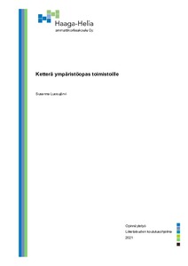 Opinnäytetyön aihe on ketterä ympäristöopas toimistoille. Työ on toiminnallinen opinnäytetyö. Tavoite oli luoda ketterä ympäristöopas, joka toimii hyödyllisenä työkaluna toimistoille. Opas antaa neuvoja toimiston hiilijalanjäljen pienentämiseen ja luonnonvarojen kohtuulliseen kuluttamiseen. Aihe on todella ajankohtainen kiihtyvän ilmastonmuutoksen takia.