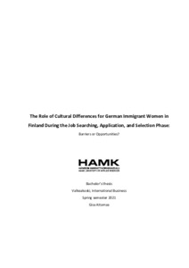 Questions regarding the labor market integration of immigrants in Finland have become more prominent with the rising number of immigrants and the growing awareness of the need of foreign workers due to demographic changes. In this context, the focus is currently on the low participation rate of immigrant women in the Finnish labor market. Their employment rate is much lower than the employment rates of immigrant men and Finnish people in Finland, as well as immigrant women in other Nordic countries. Some reports explain this phenomenon mainly with the higher financial benefits that immigrants can get in Finland in comparison to many other countries. This thesis aims to offer a different perspective on this situation by focusing on the role of cultural differences during the job searching, application, and selection phase, which represents the entrance path to the labor market. The goal is to show, through the example of the perspective of German immigrant women in Finland, whether cultural differences are perceived as barriers or opportunities in this phase, and how they might influence the participation of German immigrant women in the Finnish labor market. Another aim is to make suggestions on how potential barriers could be transformed into opportunities.