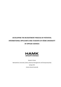 This research was conducted to develop the recruitment process of students of international degree programmes of Häme University of Applied Sciences, HAMK. The aim was to identify the phases of the application process, find out what are the strong and weak points of it and detect ways to improve the process. The goals of the improvements are to enhance the engagement of the applicants to the process and to increase the number of foreign students at HAMK. The commissioning party of the thesis is Strategic Communications of HAMK, and the set goals are based on the vision which was published along the HAMK 2030 strategy in 2019. According to the vision, HAMK will increase the number of foreign students by 76 % by 2030.