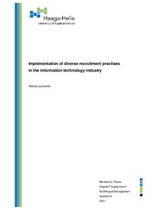 This thesis explores how diversity and inclusion are considered and managed in the information technology companies’ recruitment, if they are implemented in their organisational strategies, and how they could be developed and regarded better with different recruiting practises. The theoretical framework consists of the main concepts revolving around diversity and inclusion, recruitment practises, and diverse organisation.