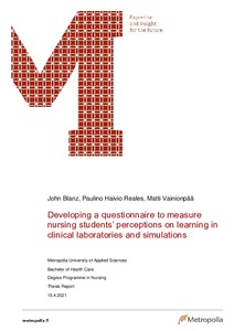 Kliinisen hoitotyön taidot ovat olennainen osa sairaanhoitajan ammattia. Suomen opetusministeriön säädöksen mukaan puolet sairaanhoitajakoulutuksesta koostuu näiden taitojen oppimisesta. Sairaanhoitajaopiskelijat harjoittelevat taitoja kliinisissä laboratorioissa, soveltavat tietämystään simulaatioissa, sekä saavat palautetta osaamisestaan. Tässä tutkimuksessa kehitettiin kyselylomake, jolla voidaan mitata sairaanhoitajaopiskelijoiden näkemyksiä oppimisesta kliinisessä laboratoriossa ja simulaatiossa.