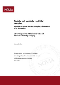 I resultatet framkom sex kategorier om Fördelar med tidig hemgång: positiv inverkan på amning, bra upplevelse av vården, emotionellt välmående, samhörighet inom familjen, fysiskt välmående för mor och barn samt kostnadseffektivitet. Nackdelar med tidig hemgång gav fyra kategorier: negativ inverkan på amning, brister i den postnatala vården, sjukdom och död bland nyfödda samt trötthet och brist på vila. Det framkom även många resultat som visade att det inte finns signifikanta skillnader mellan tidig hemgång och längre sjukhusvård, vilket presenteras i kategorin "Övriga resultat" i kategorierna: amning, mors fysiska och psykiska hälsa, nyföddas hälsa samt nyblivna mödrars syn på tidig hemgång. Den vård och det stöd som man får påverkar om tidig hemgång ger mer fördelar eller nackdelar. The purpose of this qualitative theoretical thesis is to present advantages and disadvantages found in previous research on early discharge, within 48 hours, from hospital after childbirth. The study is intended to provide a more nuanced picture and an opportunity to form an opinion about early discharge and show the areas that need further study. The thesis will answer the following questions: What are the benefits of early discharge after childbirth and what are the disadvantages? The thesis method is literature studies with an overview article. The 26 research articles are presented in a review article and analyzed using inductive content analysis. The theoretical starting points are Maternity by Mercer, Nursing relationship by Peplau and Orlando, and Comfort by Kolcaba. The theoretical background presents statistics on days of care, care after labour, puerperium and the position statements of the International Confederation of Midwives.