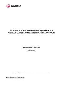 Opinnäytetyössä tutkittiin iisalmelaisten vanhempien kokemuksia osallisuudestaan lastensa päivähoitoon. Tarkoituksena oli saada tietoa päivähoidon toteutumisesta vanhempien osallisuuden näkökulmasta. Tavoitteena oli selvittää kuinka vanhemmat kokevat osallisuutensa lastensa päivähoitoon ja vaikuttaako päivähoitomuoto vanhempien kokemuksiin. Tutkimustulosten myötä toimeksiantaja saa tilannekartoituksen vanhempien osallisuuden kokemuksista ja ehdotuksista, joita voidaan käyttää päivähoidon kehittämisessä ja laadun tarkkailussa.