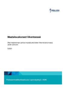 Tämä toiminnallinen opinnäytetyö käsittelee maatalouskoneiden liikennesäännöksiä muun muassa mittojen, massojen, ajokorttiluokkien, sekä muiden säännösten ja lakien mukaan. Opinnäytetyön tarkoituksena on tuottaa ohje poliisille maatalouskoneiden liikennevalvonnan yhteyteen. Poliisi työskentelee paljon liikenteessä, ja varsinkin maaseudulla maatalouskoneet ovat osana liikennettä päivittäin. Monille tämä aihe on varmasti tuntematon, eivätkä lakipykälät välttämättä ole tuoreessa muistissa. Tavoitteena on, että tästä oppaasta on hyötyä poliiseille, kun he kohtaavat maatalouskoneita liikenteessä. Opinnäytetyössä tullaan käsittelemään maatalouskoneiden ja traktoreiden tieliikennesääntöjä, kuten mittoja, massoja, nopeuksia, sekä ajokorttiluokkia. Oppaasta on rajattu pois liikennelupa, sekä ajopiirturia koskevat asiat.