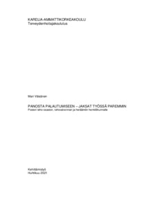 Tämän kehittämistyön tarkoituksena oli lisätä työntekijöiden työhyvinvointia muistuttamalla palautumisen tärkeydestä. Tuotoksena oli posteri palautumisesta. Posteri on tietotaulu, jolla tietoa voidaan jakaa suurellekin joukolle ihmisiä. Palautumisaiheinen posteri antaa työntekijöille tietoa ja muistuttaa palautumiseen vaikuttavista asioista.