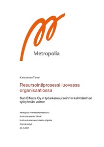 Tämä opinnäytetyö on kehitystyö, jossa kehitetään tapahtumakentällä toimivan luovan alan projektiperustaisen yrityksen erään työryhmän työaikaresursointiprosessia. Työn tarkoitus on kehittää osallistavalla tavalla prosessia tutkimustulosten ja työntekijöiden näkemyksen mukaisesti. Työ toimii yrityksen omaehtoisen työaikaresursoinnin kehittämisen seuraavana askeleena. Tätä toimintatapaa juurrutetaan työryhmään kehitysprosessin ollessa käynnissä. Työn tilaaja on kansainvälisesti toimiva monialainen design-yritys Sun Effects Oy. Yrityksen rakenne muistuttaa matriisiorganisaatiota ja kehitystyö on rajattu koskemaan Sales & Project management-työryhmän sisällä toimivaa tuotantoryhmää. Työ on konstruktiivinen tapaustutkimus, jonka aineistohankintamenetelmät ovat laadullisia. Kehitystyössä tarkastellaan yrityksen työaikaresursoinnin nykytilaa blueprinting-menetelmän mukaisesti ja verrataan sitä kahden muun luovan alan projektiperustaisen organisaation työaikaresursointiprosessien kuvauksiin benchmarking-menetelmän avulla. Tämän lisäksi toteutetaan dokumenttianalyysi yrityksen työryhmän toteutuneista projekteista. Kaikki kerätyt tulokset käsitellään työn viimeisessä vaiheessa yrityksen työntekijöistä koostuvassa fokusryhmähaastattelussa. Haastattelun aikana työryhmä muotoilee kerättyjen tulosten ja oman ammattitaitonsa perusteella uuden työaikaresursointimallin, jonka runko perustuu olemassa olevaan prosessikuvaukseen. Kehitystyön keskeisin tulos on työryhmän itselleen muotoilema ehdotus työaikaresursoinnin prosessimallista. Työryhmää kehotetaan päättämään, kuinka prosessia tulisi hyödyntää. Tulosten mukaan yrityksen tulee säilyttää joustavat työaikajärjestelynsä ja työaikaresursoinnin tulee edelleen perustua kommunikaatioon yhdessä resursoitavien henkilöiden kanssa. Vuositasoisen resursointityökalun käyttöä tulee jatkaa ja kehittää. Yrityksen tulee tämän lisäksi kiinnittää huomiota yhteisten työaikaraamien kehittämiseen koko yrityksen tasolla. Työntekijälähtöistä kehittämistyötä suositellaan itsenäisesti jatkamaan tilaajayrityksen lisäksi myös muissa alan yrityksissä.