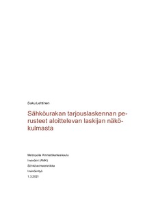 Tässä opinnäytetyössä käsiteltiin sähköurakan tarjouslaskentaa aloittavan laskijan näkökulmasta. Työn aikana perehdytettiin uusi laskija tarjouslaskentaan ja sen vaiheisiin laskentatyötä tekemällä. Työn tarkoituksena oli luoda helposti selattava kokonaisuus, joka tiivistää tarjouslaskennan yhteen työhön.