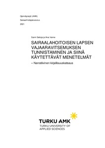 Vajaaravitsemus on haitallinen tila, jossa ravintoaineita ei saada riittävästi. Vajaaravitsemus vaikuttaa lapsen kasvuun ja kehitykseen ja sitä esiintyy sairaalahoitoisilla lapsilla. Erityisesti monidiagnoosiset sekä syöpää ja elimellisiä sairauksia sairastavat lapset ovat vajaaravitsemuksen riskissä. Tutkimuksen tarkoitus oli kirjallisuuskatsauksen avulla selvittää sairaalahoidossa olevien lasten vajaaravitsemuksen tunnistamisessa käytettäviä menetelmiä. Tutkimuksen tavoite on kehittää hoitohenkilökunnan osaamista lapsen vajaaravitsemuksen tunnistamisessa ja vajaaravitsemusmittarien käytössä. Opinnäytetyö toteutettiin toimeksiantona TYKS Lasten ja nuorten klinikalle.