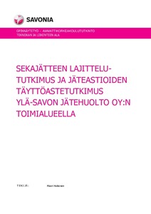 Tämän opinnäytetyön tavoitteena oli kartoittaa sekalaisen yhdyskuntajätteen koostumusta ja syntypaikkalajittelun laatua sekä jäteastioiden täyttöastetta Ylä-Savon Jätehuolto Oy:n toiminta-alueella. Tavoitteena oli selvittää, onko lajittelussa tapahtunut muutosta verrattuna vuonna 2014 tehtyyn tutkimukseen. Lisäksi tutkimuksen tavoitteena oli arvioida, onko alueellisia jätetaksoja tarpeen muuttaa ja tässä hyödynnettiin jäteastioiden täyttöastetutkimusta. Opinnäytetyön toimeksiantajana oli Ylä-Savon Jätehuolto Oy. Tutkimusta tehtiin vuonna 2020 kesällä ja talvella, yhteensä kahdeksan kertaa.