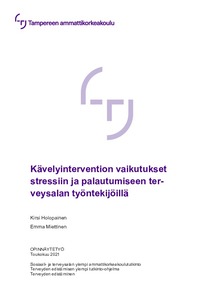 Stressi on yleistä työikäisten keskuudessa ja työn rasittavuus on lisääntynyt. Aiempien tutkimusten mukaan liikunta vähentää stressiä ja parantaa palautumista, ja hyvä fyysinen kunto auttaa sietämään stressiä paremmin. Kävelyn vaikutuksia stressiin tai palautumiseen on tutkittu vähemmän. Tämän tutkimuksen tarkoituksena oli tuottaa tietoa kävelyn vaikutuksista stressiin. Tavoitteena oli selvittää, voidaanko 8 viikon kävelyintervention avulla vähentää koettua stressiä ja parantaa palautumista. Tutkimusjoukko koostui Vetrea Terveys Oy:n työntekijöistä (n=13). Tutkimusmenetelmänä käytettiin monimenetelmätutkimusta, koska kävelyjaksolle osallistuneen pienen tutkimusjoukon kokemuksista ja kävelyjakson vaikutuksista haluttiin tuottaa laaja-alaista tietoa. Ennen kävelyjaksoa osallistujille toteutettiin Firstbeat Hyvinvointianalyysi, liikuntakysely ja subjektiivista stressiä mittaava PSS-stressikysely. Kävelyjakson jälkeen PSS toistettiin ja kartoitettiin osallistujien kokemuksia kävelyjaksosta.