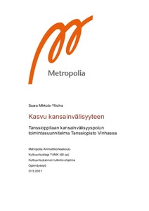 Kasvu kansainvälisyyteen – Tanssioppilaan kansainvälisyyspolun toimintasuunnitelma on tutkimuksellinen kehittämistyö Tanssiopisto Vinhalle. Työn tavoitteena on ollut muodostaa tanssioppilaan kansainvälisyyspolku, joka vastaa oppijan yksilöllisen kasvun tukemiseen ottaen huomioon opistolla käytössä olevan taideopintorakenteen potentiaali. Kehittämistyön viitekehyksenä toimii kansainvälisyyskasvatus ja kestävä taiteen perusopetus. Tutkimuksen päämääränä on ollut toimivan toimintasuunnitelman mallin luominen Tanssiopisto Vinhalle ja saattaa tutkimuksen tulokset myös muiden taide- ja tanssioppilaitosten käyttöön.