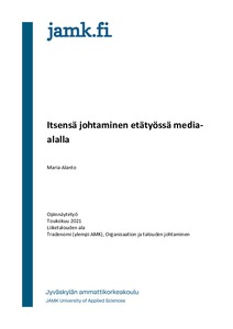 Media-alan asiantuntijatyö on luonteeltaan luovaa ja itsenäistä. Haastattelujen perusteella itsensä johtamisen valmiuksina korostuivat omaehtoisuus, työympäristö sekä kyvykkyydet. Näitä valmiuksia haastavat etäaikana erityisesti yhteisöllisyyden puute, ajoittainen motivaation aaltoilu ja ajanhallinnan haasteet. Asiantuntijoiden itsensä johtamisen taidot ovat haastattelun perusteella keskimäärin kuitenkin hyvällä tasolla. Tuloksia voidaan hyödyntää jatkossa esimerkiksi etätyökokemuksen kehittämiseksi asiantuntija-aloilla.