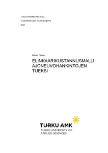 Opinnäytetyön tavoitteena oli löytää keino ajoneuvojen elinkaarikustannusten arvioimiseksi ja luoda käytännöllinen sekä toimiva elinkaarikustannusmalli Turun kaupungin konsernihallinnon hankintapalveluiden käyttöön. Mallia on tarkoitus hyödyntää tulevissa ajoneuvohankinnoissa yhtenä mahdollisena valintakriteerinä tarjousten vertailussa. Mallia on mahdollista hyödyntää myös laaja-alaisemmassa päätöksenteossa. Elinkaarikustannusmallin tarkoituksena on tarjota tarkempaa tietoa hankinnan kohteisiin liittyvistä kokonaiskustannuksista, johon aiemmin ei ollut olemassa johdonmukaista menetelmää.