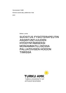 Suositus sisältää kuvauksen palliatiivisesta fysioterapiasta, sen järjestämisen edellytyksistä ja ohjaa koulutuksen sekä tutkimuksen lisäämiseen. Palliatiivinen fysioterapia lisää hoidon laatua ja fysioterapian mahdollisuuksien hyödyntäminen moniammatillisen tiimityön kautta hyödyttää niin asiakkaita kuin hoitohenkilökuntaa. Fysioterapiasta palliatiivisessa hoidossa, palliatiivisen kuntoutuksen palveluketjuista ja fysioterapian kustannusvaikutuksista palliatiivisessa hoidossa tarvitaan lisää tutkimusta. Tarvitaan myös keinoja resurssien uudelleen suuntaamiseksi, jotta fysioterapeutin liittäminen osaksi palliatiivisen hoidon tiimejä eri palliatiivisen hoidon järjestämisen tasoilla mahdollistuu. The need of palliative care is increasing in Finland and all over the world. All healthcare professions need better understanding and competency about the area. High-quality palliative care is multidisciplinary cooperation where physiotherapy is also needed. The thesis was implemented as a development project and it is part of Developing palliative nursing and medical education through multi-disciplinary cooperation and working life collaboration ̶ EduPal ̶ project by the Finnish Ministry of Education and Culture.