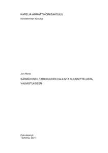 Tämän opinnäytetyön tarkoituksena oli selvittää särmäyksen tarkkuutta suunnittelusta valmiiseen kappaleeseen. Kirjallisuudesta ja standardeista selvitettiin särmäyksen tarkkuuteen liittyvät asiat, kuten esim. levyn takaisin jousto taivuttamisessa ja levyn oikaistu pituus ennen särmäystä.