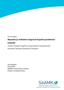 Opinnäytetyön aiheena oli tutkia yleisten kirjastojen reagointia ja kokemuksia koronapandemiasta kevään ja kesän 2020 aikana Suomessa, Ruotsissa, Norjassa ja Tanskassa. Tavoitteena oli saada selville mitä voimme oppia kokemuksista koronapandemiasta ja siihen reagoinnista yleisissä kirjastoissa. Tutkimusjoukoksi valittiin Suomen maakuntakeskusten pääkirjastot, sekä Ruotsin, Norjan ja Tanskan läänien pääkaupunkien kirjastot. Otosjoukko valittiin sen maantieteellisen kattavuuden vuoksi. Opinnäytetyön tarkoituksena oli saada selville, miten voisimme jatkossa varautua vastaaviin kriisitilanteisiin paremmin.