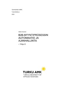 Tämän opinnäytetyön tarkoituksena oli luoda Yritys X:lle toimintasuunnitelma liittyen myyntiprosessin automatisointiin, tehokkuuden nostamiseen ja ajanhallinnan ongelmien ratkaisuun sekä ennaltaehkäisyyn. Suoritetun tutkimuksen tarkoituksena oli selvittää, onko eri organisaatioissa toimineilla B2B-myyntihenkilöillä ollut haasteita oman ajanhallintansa kanssa, miten mahdollisia haasteita on lähdetty ratkaisemaan ja onko myyntiprosessia mahdollisesti lähdetty erilaisin työkaluin automatisoimaan. CRM-järjestelmän parempi hyödyntäminen on myös keskeisessä osassa toimintasuunnitelmaa.