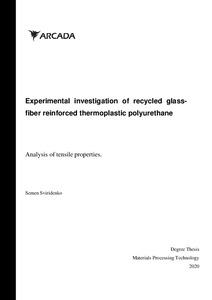 With the growing number of glass-fiber reinforced composite waste generated each year, the issue of composite waste management becomes recognizable. Mechanical recycling is a well-investigated recycling pathway. Tensile Testing is one of the fundamental investigative tools used in materials’ sciences. It can be used to compare the recycled material with the virgin. The aim of this thesis work is to investigate the mechanical properties of recycled glass-fiber reinforced thermoplastic polyurethane. Effect of drying of the composite prior to manufacturing was investigated. Comparison was made with the virgin composite. Material’s behavior under manufacturing and processing conditions was investigated. In total, four material groups were formulated, manufactured, and tested: dried recycled composite, undried composite, recycled composite with 12.5% virgin composite by weight, and virgin composite. Specimens were tested for Tensile Strength and Percent Elongation at Break. Dried and Undried composite showed a loss of 22 % and 27.3 % of Tensile Strength. Similarly, Dried and Undried composite showed a loss of 9.17 % and 16.7 % in Percent Elongation at Break. Compounded composite showed a loss of 6.3 % if Tensile strength and a gain of 7.6 % in Percent Elongation at Break. Mechanical recycling appears to result in the loss of mechanical properties in recycled composite. Compounding the recycled composite with the virgin results in greater retention of Tensile Strength and a minor gain in Percent Elongation at Break. Based on the findings, it cannot be concluded that drying the recycled composite improves the retention of mechanical properties