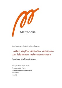 Tässä opinnäytetyössä kuvataan lasten varhaisia käytöshäiriöitä ja niiden tunnistamista sekä huomioimista lastenneuvolassa. Opinnäytetyön tarkoituksena on kuvailevan kirjallisuuskatsauksen avulla tuoda ilmi lasten käytöshäiriöihin liittyviä piirteitä. Kirjallisuuskatsauksen avulla tutkitaan sitä, miten lasten käytöshäiriöitä voidaan tunnistaa varhaisessa vaiheessa, millä keinoin ongelmiin ja heränneisiin huoliin voidaan puuttua sekä mitkä asiat vaikuttavat laadukkaaseen hoitotyöhön käytöshäiriöiden huomioimisessa. Tavoitteena on tuottaa ajankohtaista tietoa lasten käytöshäiriöistä ensisijaisesti lastenneuvolassa työskentelevien terveydenhoitajien hyödyksi.