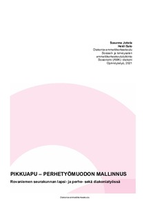 Pikkuapu – perhetyömuodon mallinnus Rovaniemen seurakunnan lapsi- ja perhe- sekä diakoniatyössä on työelämälähtöinen, kehittämispainotteinen opinnäytetyö, joka on alle kouluikäisten lasten perheille suunnattu uusi työmuoto. Pikkuapu on tarkoitettu äkilliseen ja tilapäiseen tarpeeseen. Työs-sä esitellään Pikkuavun mallinnuksen lähtökohtia, kehittämisympäristöä, kehittämistyön suunnittelua ja toteutusta sekä toiminnasta kerättyjen kyselyjen palauteaineistoa. Opinnäytetyössä on nostettu esille yksi yhteistyökumppani, Rovaniemen kaupungin lastensuojelu, ja sen kanssa tehtävä yhteistyö.