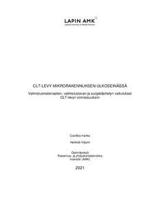 Tämän opinnäytetyön tarkoitus oli tuottaa toimeksiantajanani toimivalle Lapin Ammattikorkeakoulun CoolBox-hankkeelle tietoa siitä, miten eri puulajien tai -tuotteiden ominaisuudet, käytettävä liima ja valmistustapa vaikuttavat CLT-levyn ominaisuuksiin. Lisäksi selvitettiin, miten nämä ominaisuudet vaikuttavat CLT-levyn kestävyyteen ja ulkonäköön, kun CLT-levy on siirreltävän mikrorakennuksen ulkoseinämateriaalina Suomen ilmastossa. Tässä työssä tarkasteltiin CLT:ssä käytettäviä liimoja, puulajeja ja valmistustapaa myös päästöluokitusten, määräysten ja käyttöiän näkökulmasta. Päätavoite tässä työssä oli tutkia mahdollisuuksia käyttää CLT-levyä käyttöluokassa 3, sekä tätä varten vaadittavia toimenpiteitä sekä huomioitavia asioita seinärakenteen osalta.