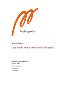 Tämän opinnäytetyön tarkoituksena on kertoa yleisimmistä asioista, jotka vaikuttavat viestinnän kulkuun rakennushankkeessa. Työssä perehdyttiin aikatauluihin, työturvallisuuteen, kosteudenhallintaan, laadunvarmistukseen, hankintoihin ja logistiikkaan sekä lisä- ja muutostyöhön.