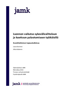 Tutkimuksessa todettiin koetun palautumisen keskiarvon kohentuneen koeryhmällä luontointerventiojaksojen jälkeen. Koetun palautumisen tulokset olivat ristiriidassa fysiologisen palautumisen kanssa, joka saattaa selittyä yksilö- ja ympäristötekijöillä. Luontohetkien palauttavuutta on voinut heikentää suunniteltua raskaampi liikunta, joka oli havaittavissa mittaustuloksista. Luonnon vaikutusta palautumiseen tulisi jatkossa tutkia lisää kontrolloidummassa luontoympäristössä. Psychological stress among working-age people has increased in recent years, for example, work-related stress has increased due to the growing pressures of working life. Work-relates stress has negative effects on the health and well-being of the individual, as well as having costs at the societal level. Nature has been shown to contribute positively to both mental and physical well-being. Even short periods of exposure to nature have a positive effect on blood pressure and heart rate, also activating the parasympathetic nervous system, increasing heart rate variability. Spending time in nature contributes to mental health by helping to recover from stress and improving mood. Nature as an environment is important to the vast majority of Finns. So far, the effect of nature on heart rate variability has been studied in short-term (1–2 nature interventions) studies, and thus, a longer 10-day nature intervention was chosen for this study.