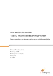 Jalkapallo on maailman harrastetuin joukkuelaji ja sen suosio jatkaa kasvuaan etenkin tyttö- ja naispelaajien keskuudessa. Jalkapallon vammariski on kansainvälisten tutkimustulosten mukaan suuri. Naisjalkapalloilijoilla nilkka on yksi yleisimmin vammautuvista kehon osista. Nilkan nivelsiteet vammautuvat yleisimmin jalkapallollekin ominaisissa liikkeissä, kuten hypyissä, kiihdytyksissä ja suunnanvaihdoksissa. Opinnäytetyömme yhteistyökumppanina on jalkapalloseura FC Hongan naisten edustusjoukkue.Työn tavoitteena on antaa yhteistyöjoukkueen valmennustiimille tietoa nilkan nivelsidevammoista, niiden esiintyvyydestä, mekanismeista, riskitekijöistä sekä alkuverryttelyn merkityksestä nilkkavammojen ehkäisyssä. Työn tarkoituksena on tuottaa naisjalkapalloilijoille suunnattu neuromuskulaarinen alkuverryttelyohjelma, joka pyrkii kehittämään pelaajien kehonhallintaa ja motorisia taitoja lajinomaisissa liikkeissä ja sitä kautta mahdollisesti pienentämään nilkan nivelsidevammojen riskiä. Yleisesti liikuntavammojen ennaltaehkäisyssä on ehdotettu edettävän van Mechelenin ym. nelivaiheisen mallin mukaisesti: 1) lajin tyyppivammojen esiintyvyyden ja vakavuuden selvittäminen 2) vammamekanismien ja riskitekijöiden tutkiminen 3) vammojen ehkäisykeinojen suunnittelu kahden ensimmäisen vaiheen pohjalta 4) kehitetyn menetelmän tehon tutkiminen. Opinnäytetyössämme olemme edenneet edellä mainittujen vaiheiden mukaisesti viimeistä vaihetta lukuun ottamatta. Opinnäytetyön tuotoksena on naisjalkapalloilijoille suunnattu lajinomainen neuromuskulaarinen alkuverryttelyohjelma, joka sisältää juoksulämmittely ja -tekniikkaosion, asennon hallinta ja tasapaino-osion, plyometrisen harjoitteluosion ja voimaharjoitteluosion.