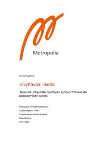 Tämän opinnäytetyön tarkoituksena oli suunnitella taukoliikuntajuliste opettajille ja varhaiskasvatuksen työntekijöille. Tavoitteena oli tukea opettajien ja lastentarhanopettajien palautumista ja työssä jaksamista. Yhteistyökumppanina toimi Agape-keskus ry, joka ylläpitää koulua ja päiväkotia. Työtä varten kerättiin tietoa opettajan työn kuormitustekijöistä ja taukoliikunnan hyödyistä palautumisessa, ja juliste suunniteltiin hankitun tiedon pohjalta.