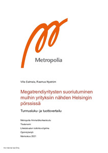 Tämän opinnäytetyön tarkoituksena oli selvittää, suoriutuvatko Helsingin pörssiin listatut megatrendiyritykset keskimäärin paremmin kuin Helsingin pörssin muut yritykset. Työn tarkoituksena oli myös selvittää, voiko megatrendiyrityksiin sijoittamalla saada parempaa tuottoa kuin sijoittamalla yrityksiin, jotka toimivat muilla toimialoilla Helsingin pörssissä. Valitsimme 12 eri yritystä, joiden toimiala oli jokin valitsevammistamme megatrendeistä ja saman määrän yrityksiä, joiden toimialaa ei voida lukea megatrendeihin. Tutkimuksella haluttiin selvittää, tulisiko sijoittajan ottaa megatrendit ja niiden vaikutukset huomioon tulevaisuuden sijoituspäätöksiä tehtäessä.