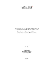 Kokeiluista syntyvistä teoksista huomasin, miten paljon materiaali vaikuttaa teoksen lopputulokseen ja miten eri tekniikat onnistuivat niihin. Jokaiseen materiaaliin pitää ottaa siihen sopiva polttotekniikka ottaen materiaalin ominaisuudet huomioon, jotta saa haluamansa lopputuloksen. This thesis explored pyrography through different materials, which was achieved by making one work on every material. The main research question shaped into; what pyrography imprints look like on different materials. Additional questions, which defined and concretized the research problem were, does materials have effect on artworks result and how does the same design succeed on various materials.