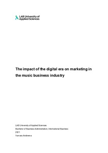 The thesis purpose was to explore the impact of digital era on marketing in music business. The music industry went to a lot of transformational processes due to digitalization. The digital era provided a lot of opportunities for the music business as well as new challenges.
