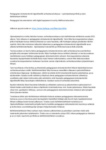 Opinnäytetyöni on tehty Hattulan kunnan varhaiskasvatuksessa työn kehittämisen tehtävänä vuoden 2021 aikana. Työn aiheena on pedagoginen dokumentointi digivälineillä. Työni liittyi koronapandemian aikaan, jolloin huoltajien kanssa tehtävä yhteistyö sai uusia haasteita, sillä huoltajien pääsyä päiväkotien tiloihin rajattiin. Näin ollen toiminnan näkyväksi tekeminen ja pedagoginen dokumentointi digivälineillä nousi yhdeksi kehittämiskohteeksi. Opinnäytetyö toteutettiin portfoliomuotoisena Bulb-alustalle.