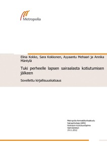 Opinnäytetyön tarkoituksena oli kuvata millaista tukea perheet ovat saaneet lapsen sairaalasta kotiutumisen jälkeen. Työn tavoitteena oli auttaa lastenosastoilla työskenteleviä sairaanhoitajia heidän jokapäiväisessä työssään sekä mahdollistaa perheiden kattavampi tuki ja seuranta lapsen sairaalasta kotiutumisen jälkeen. Opinnäytetyö kuului Lasten ja nuorten hoitotyön tulevaisuuden osaaminen –hankkeeseen, joka toteutettiin yhteistyössä Metropolia ammattikorkeakoulun Hoitotyön koulutusohjelman, Tampereen yliopiston Hoitotieteen laitoksen sekä HYKS:n Naisten- ja lastentautien tulosyksikön kanssa.