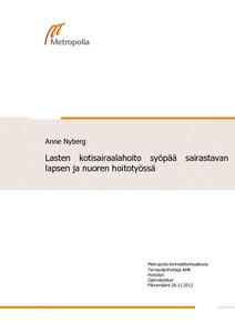 Opinnäytetyö toteutettiin Lasten ja nuorten hoitotyön tulevaisuuden osaaminen- hankkeessa. Hankkeen yhteistyökumppaneina olivat Helsingin yliopistollisen keskussairaalan (HYKS) Naisten- ja lastentautien tulosyksikkö, Metropolia ammattikorkeakoulun Hoitotyön koulutusohjelma ja Tampereen yliopiston Hoitotieteen laitos.
