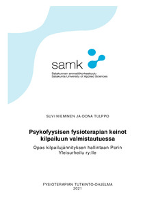 Kyseessä on toiminnallinen opinnäytetyö. Työ toteutettiin vapaana kirjallisuuskatsauksena etsien ajantasaista tietoa aiheesta Porin Yleisurheilu ry:lle, jolla ei ole aiemmin ollut käytössä psyykkistä valmennusta. Opinnäytetyön tavoitteena oli kehittää nuorten kilpailevien urheilijoiden psyykkisiä taitoja ja lisätä keinoja kilpailujännityksen hallintaan valmennuksen kautta. Päämääränä oli soveltaa psykofyysisen fysioterapian keho-mieli -näkökulma mukaan kilpailuun valmistautumiseen. Tähän tarkoitukseen osana opinnäytetyötä tuotettiin opas, joka sisältää kirjallisia ohjeita ja YouTube-linkkejä harjoitteista. Harjoitteiden avulla saadaan lisättyä psyykkisen valmennuksen keinoja ja urheilijoiden jännityksen hallintakeinoja. Competitive sports have positive and negative effects on a young person who has only recently started competing. Competing might be experienced very suspense. For an adolescent competitive athlete, dealing with emotions can be new and can be experienced as challenging. Uncontrolled emotions, on the other hand, can have a negative impact on the performance of the competition itself. It is good to practice the skills of handling and managing emotions such as suspense and fear using appropriate means.