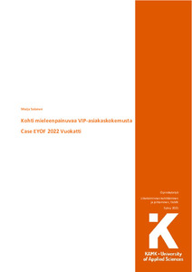 Tämän opinnäytetyön toimeksiantaja on EYOF 2022 Vuokatti ja Kainuun Liikunta. Opinnäytetyön tarkoituksena on tutkia ja koota tietoa asiakaskokemuksesta, sen muodostumisesta ja asiakkaan odotuksiin vastaamisesta sekä niiden ylittämisestä urheilutapahtumassa. Opinnäytetyön tavoitteena on kehittää mieleenpainuvan VIP-asiakaskokemuksen toimintamalli ja koota talkoo-ohjeistus European Youth Olympic Festival 2022 Vuokatti -tapahtuman VIP-vieraiden osalta. Lisäksi tavoitteena on luoda korkeatasoinen tapahtumakokemus EYOF 2022 -tapahtuman VIP-vieraille.