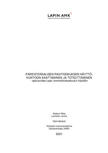 Tämä opinnäytetyö toteutettiin yhteistyössä Lapin ammattikorkeakoulun kanssa. Opinnäytetyön aiheena oli parenteraalisen ravitsemuksen käyttökuntoon saattaminen ja toteuttaminen potilaalle. Opinnäytetyön tarkoituksena oli tehdä hoitotyön opetukseen video parenteraalisen ravitsemuksen toteuttamisesta. Tavoitteena oli lisätä opiskelijoiden tietoisuutta parenteraalisesta ravitsemuksesta ja tuoda varmuutta parenteraalisen ravitsemuksen toteuttamiseen. Aihe on jokaiselle hoitotyön opiskelijalle oleellinen ja ajankohtainen.